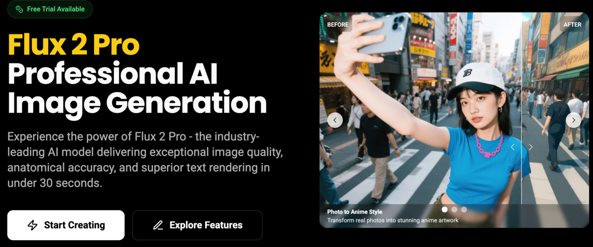 Professional AI image generation platform powered by Flux 2 Pro. Create stunning visuals with exceptional quality, anatomical accuracy, and superior text rendering.