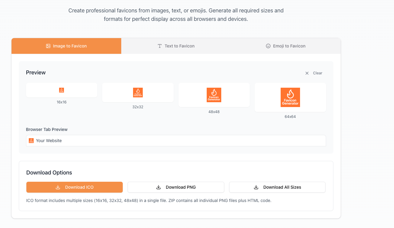 Create professional favicons from images, text or emojis. Generate all sizes & formats for perfect display. Free online favicon maker with instant preview.