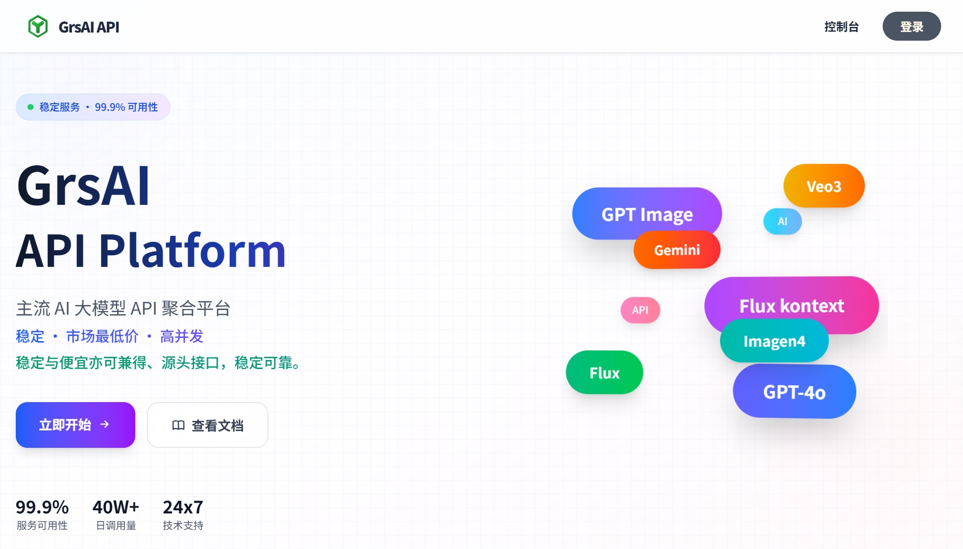 GrsAI offers affordable AI APIs for GPT-4o, Gemini, Flux, and Veo3, with image generation at ¥0.02 and video at ¥0.8. Enjoy 99.9% uptime and fast responses. Start with 5000 free credits.