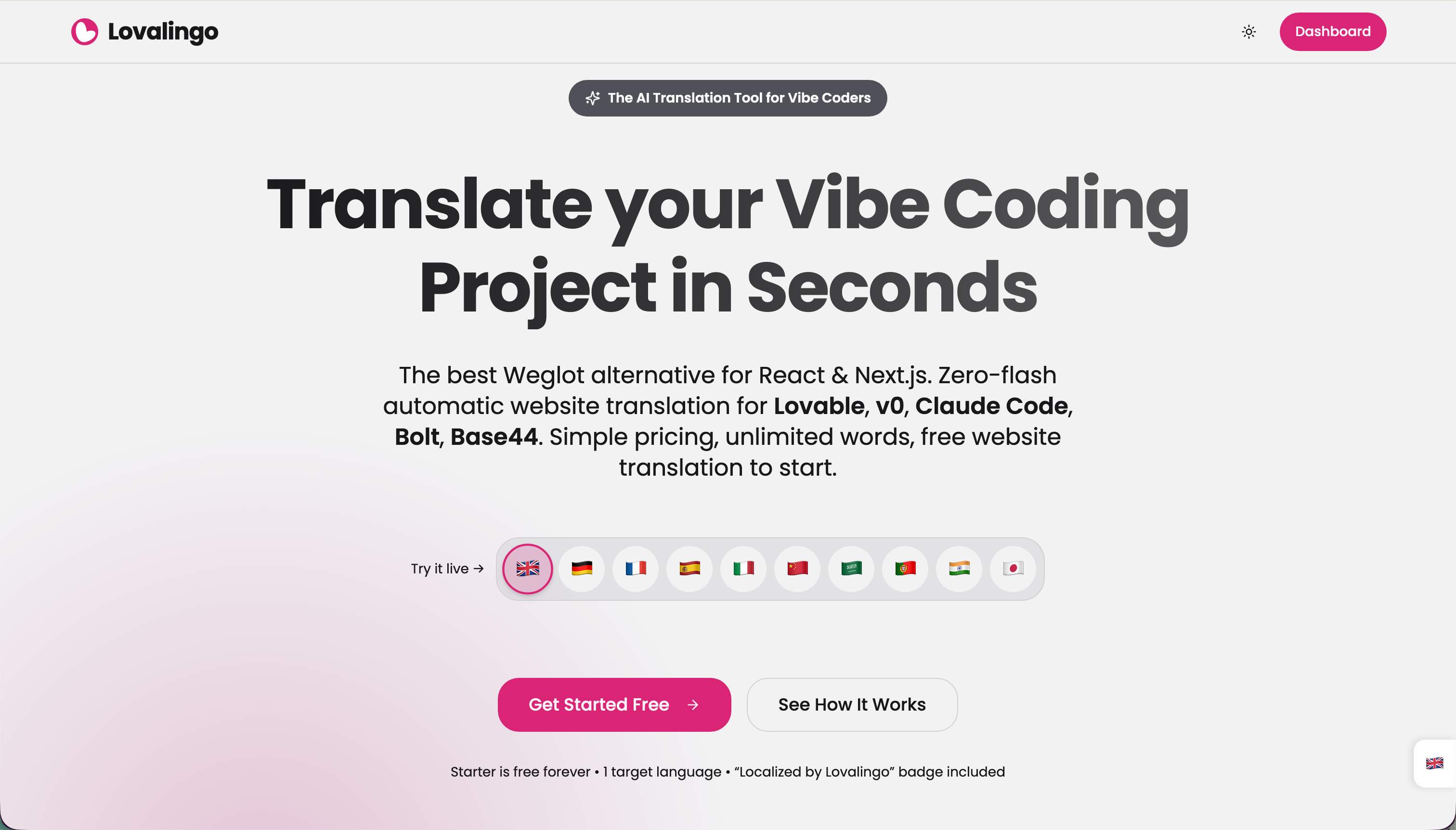Translate and index React apps in 60s. Zero-flash, render-native translation with automated SEO & sitemaps. Built for Lovable, v0, and Bolt. No JSON.
