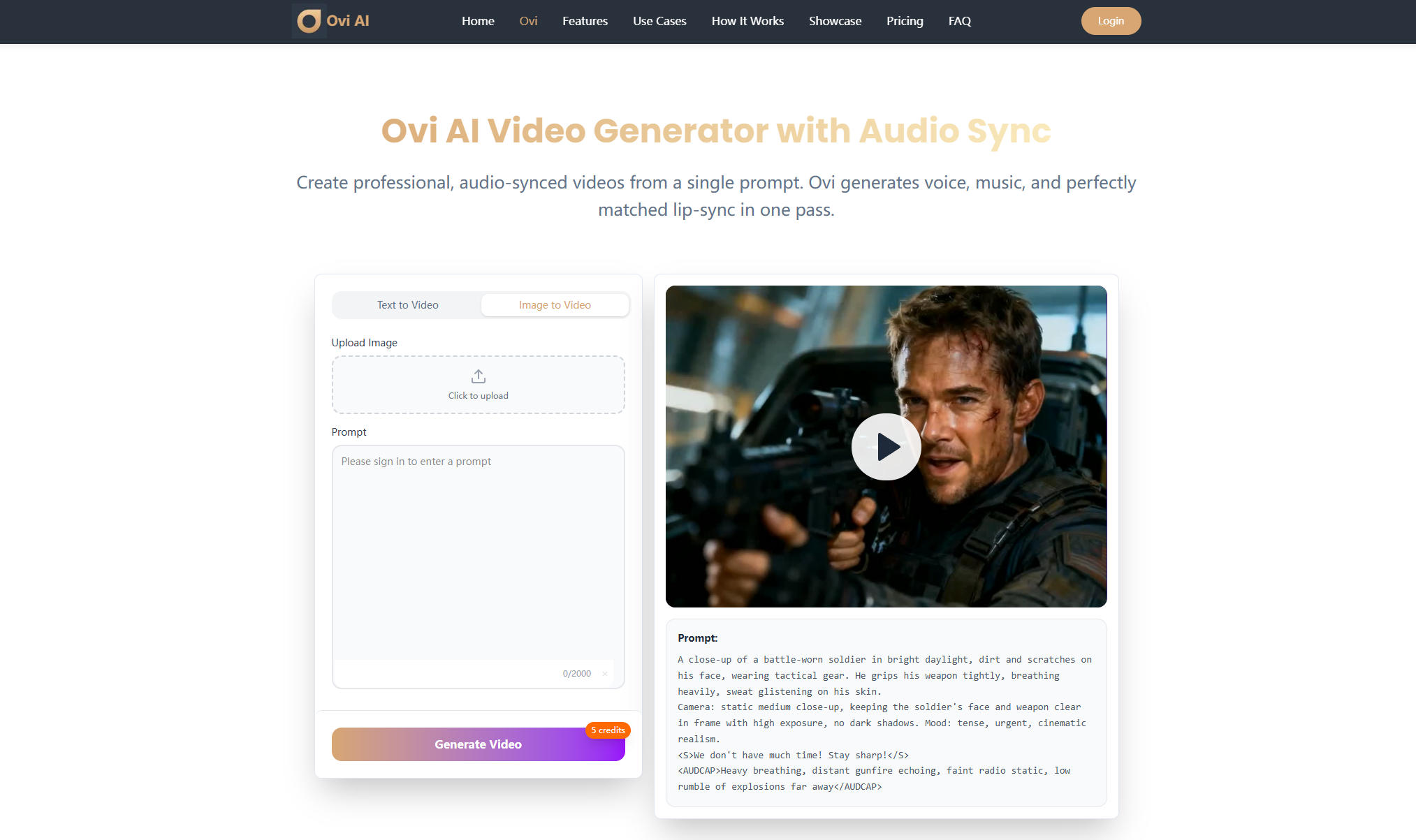 Ovi AI generates talking characters with synced audio in 5 seconds using text prompts. It supports image to video and text to video.