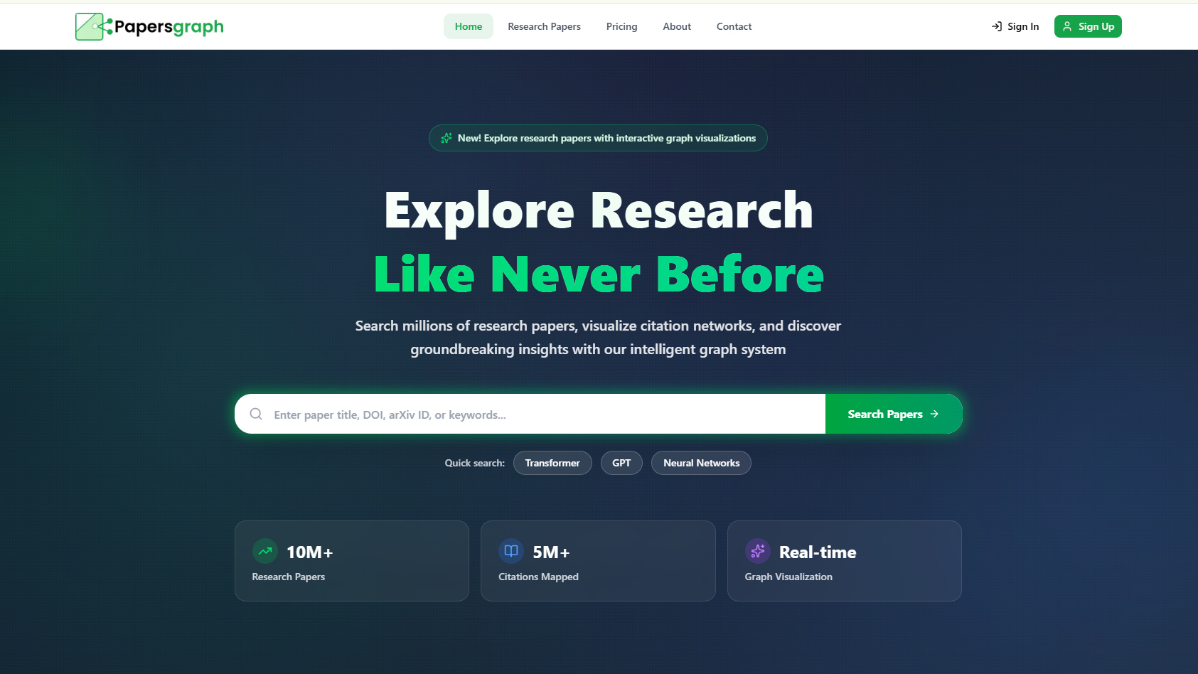 Papersgraph is a powerful research paper search and visualization platform specifically designed for AI and machine learning researchers. The site contains over 10 million research papers and has mapped 5 million citations. Its most attractive feature is the interactive graph visualization system, which allows users to view citation networks and connections between different papers. Research papers on computer science, medicine, natural language processing, and computer vision can be easily found here. The trending section displays the most cited and influential papers. Detailed information for each paper including author names, publication year, citation count, and in many cases direct PDF download links are available. Due to its real-time search functionality and graphical representation, it serves as an extremely useful tool for researchers and students seeking to explore academic literature and understand research connections efficiently.
