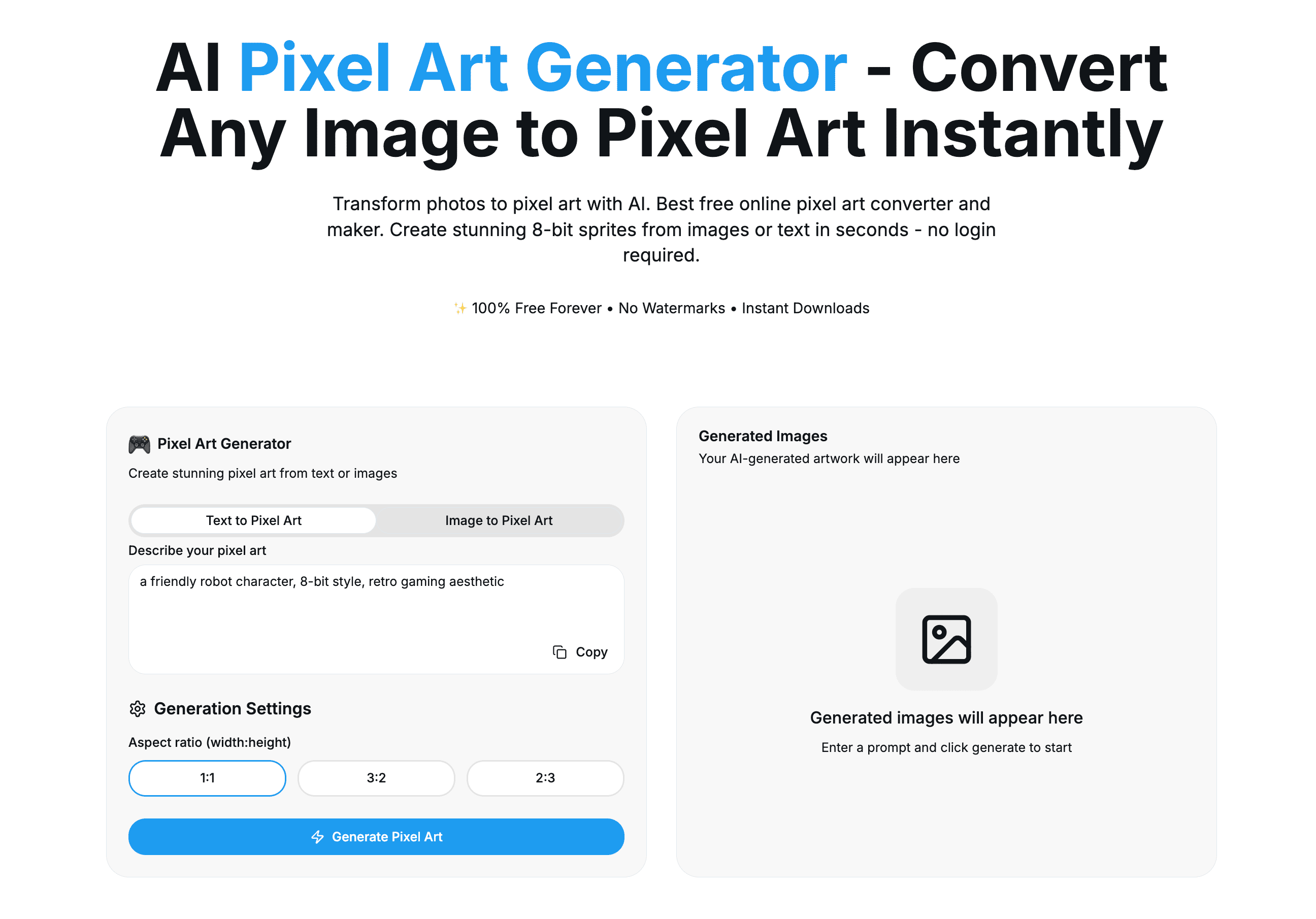 Transform photos to pixel art instantly. Free AI pixel art generator & converter. Create 8-bit sprites from images or text. No signup required.