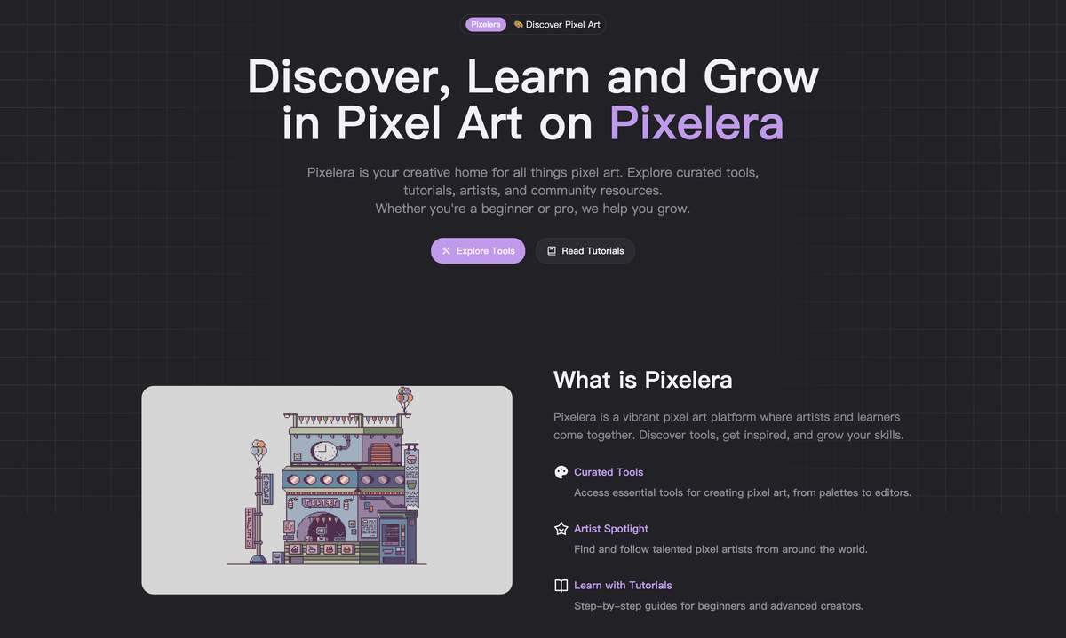 We highlight world-class pixel artists so you can study their techniques, styles, and creative process — and we curate the best tools and tutorials to help you level up your own skills. Whether you’re a beginner or a seasoned creator, Pixelera is your launchpad to learn, improve, and create with confidence.