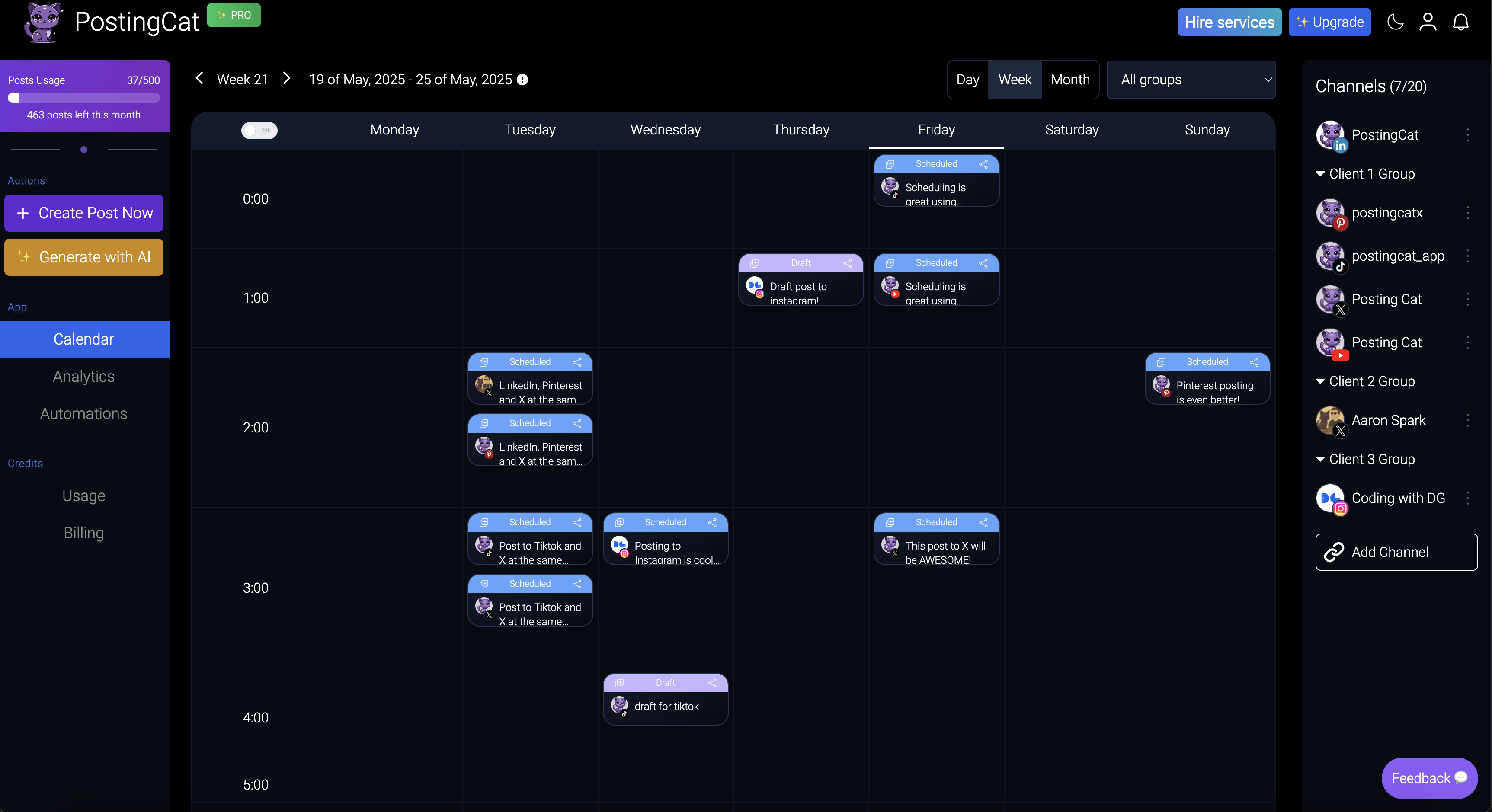 PostingCat is a platform that lets you connect all your social media accounts and manage them in the same place including calendar, automations, analytics and settings up cross-posting.