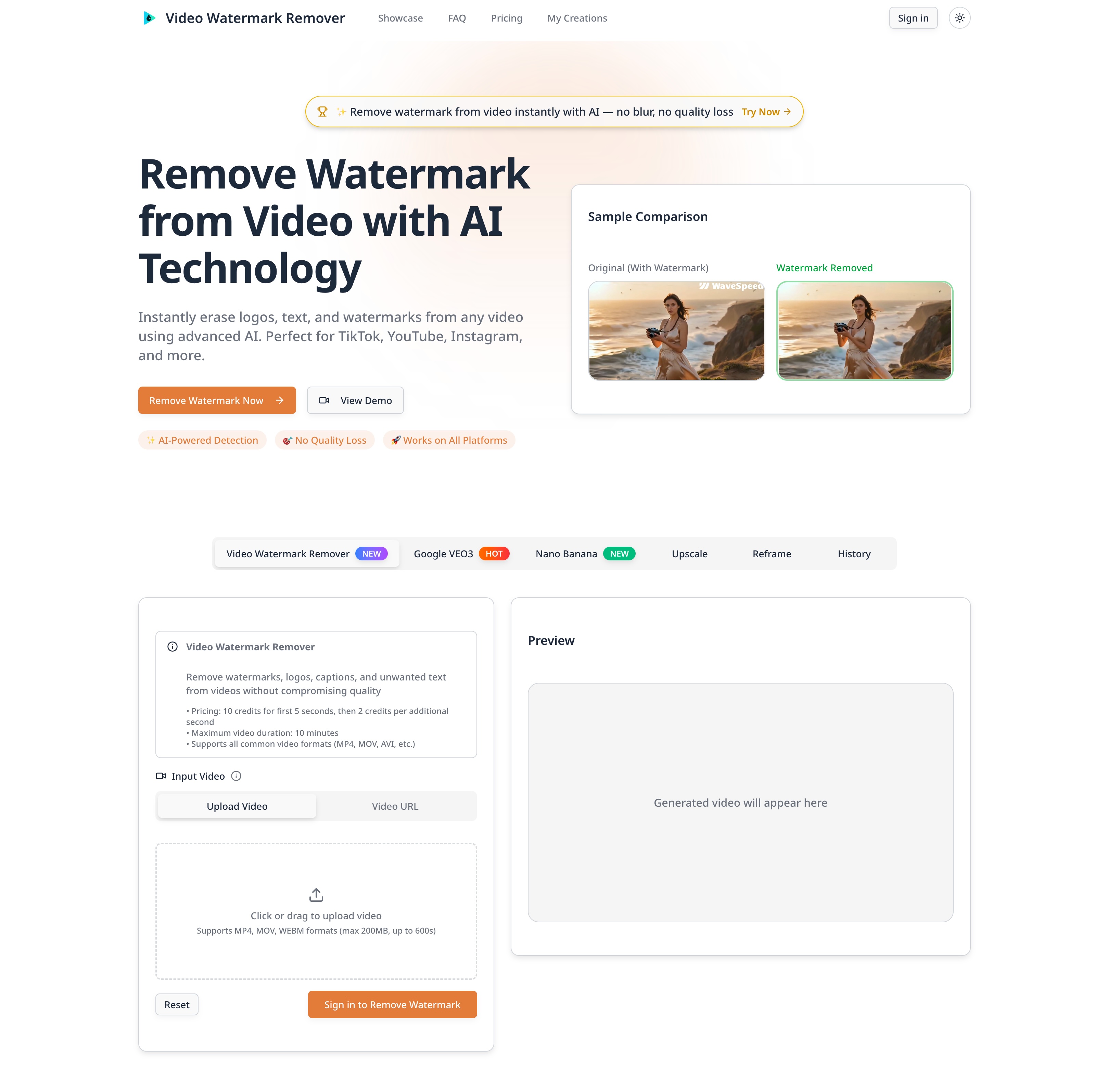 Remove watermark from video instantly with AI technology. Erase logos, text, and watermarks from TikTok, YouTube, Instagram videos without blur or quality loss.
