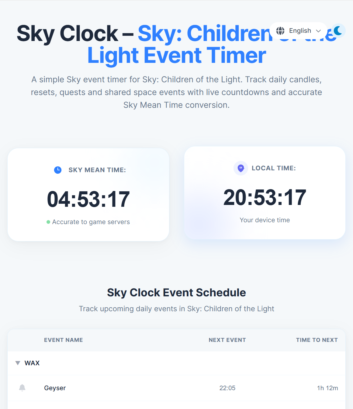 A simple Sky event timer for Sky: Children of the Light. Track daily candles, resets, quests and shared space events with live countdowns and accurate Sky Mean Time conversion.
