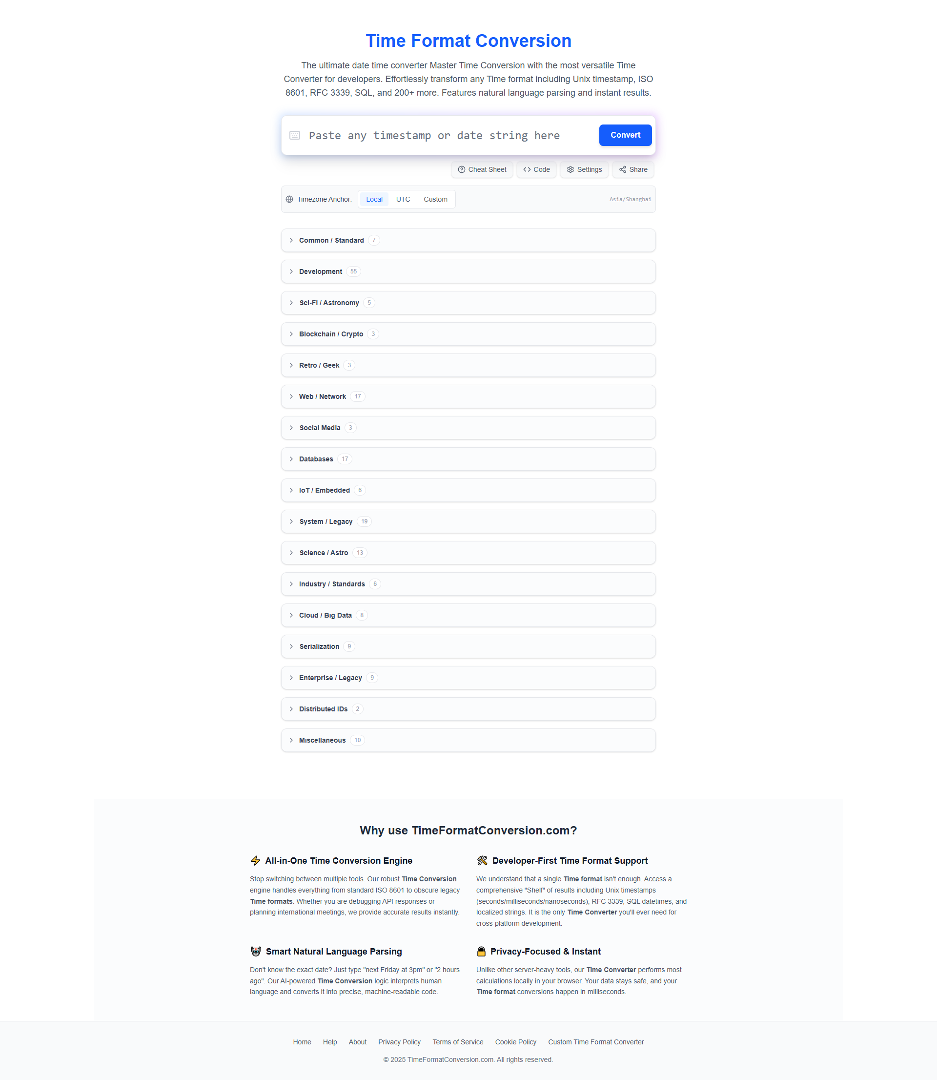 TimeFormatConversion.com is a cutting-edge platform revolutionizing time format transformations for developers, businesses, and individuals. This all-in-one solution handles complex conversions between various time formats used across programming languages, databases, and international standards.