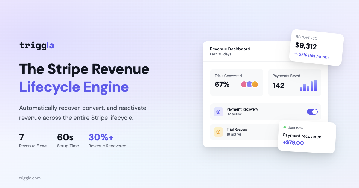Triggla is a revenue recovery engine for Stripe businesses. It automatically recovers failed payments, converts expiring trials, wins back churned customers, and drives repeat purchases.