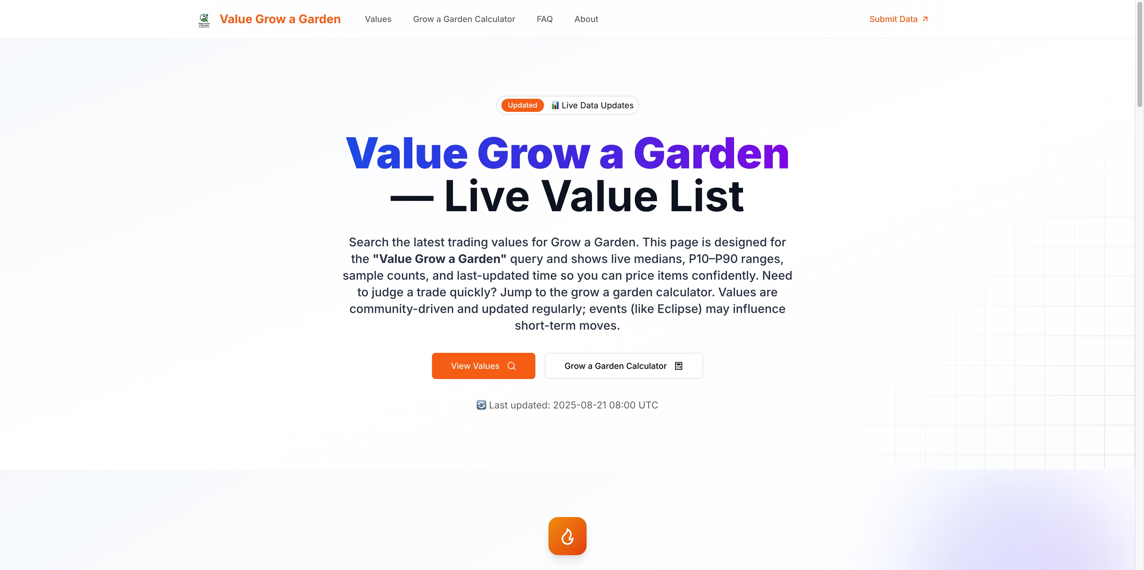 A lightweight, data-driven companion site that helps Grow a Garden players trade with confidence. It provides a live value list for items and a one-click Win / Fair / Lose checker so you can sanity-check a trade in seconds.