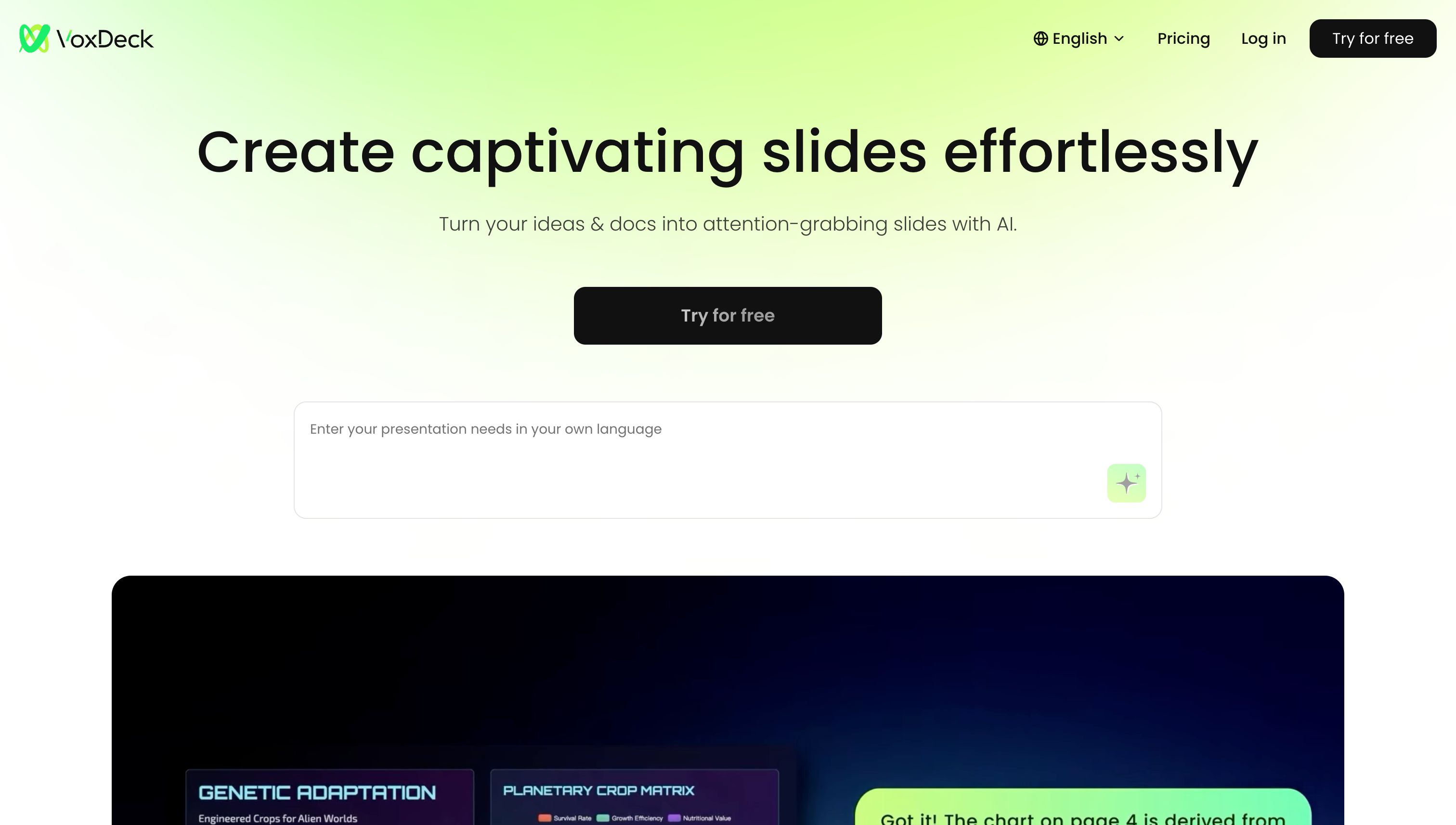 VoxDeck, the next-gen AI presentation maker, lets you ditch generic slides. Access 3D charts to bring your data to life, animated slides, and presentable avatar via simple dialogue. No design skills required—create engaging, attention-grabbing slides easily.
