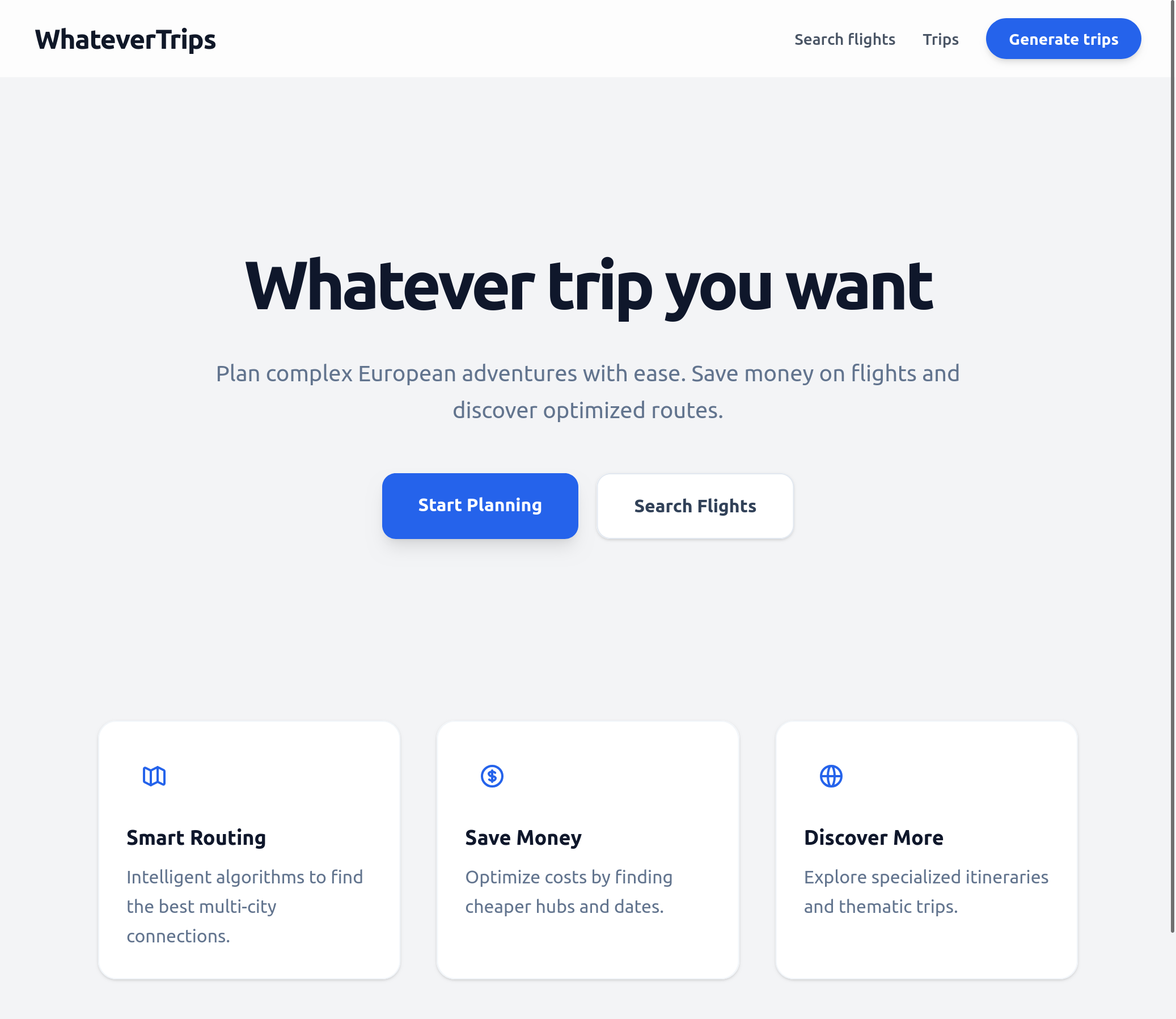 WhateverTrips is a flexible trip planner for multi-city travel, helping travelers compare routes, build itineraries, and plan smarter trips across multiple destinations.