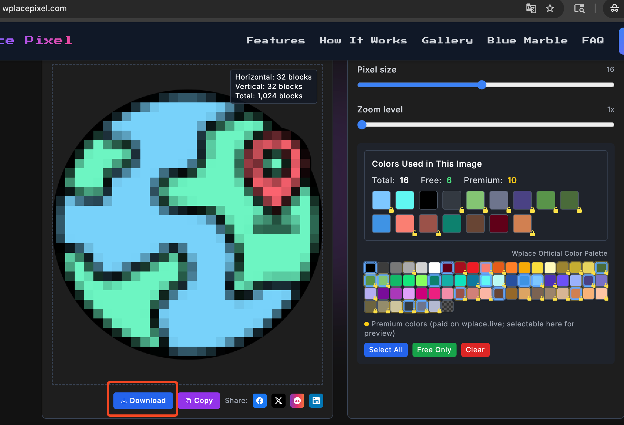 Turn any image into crisp pixel art and see the grid math instantly — pixel size, block counts, and palette costs (free vs premium) for building on wplace.live.